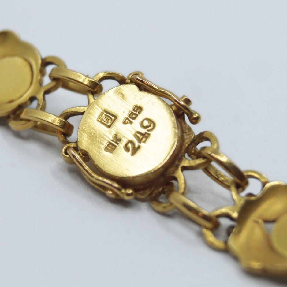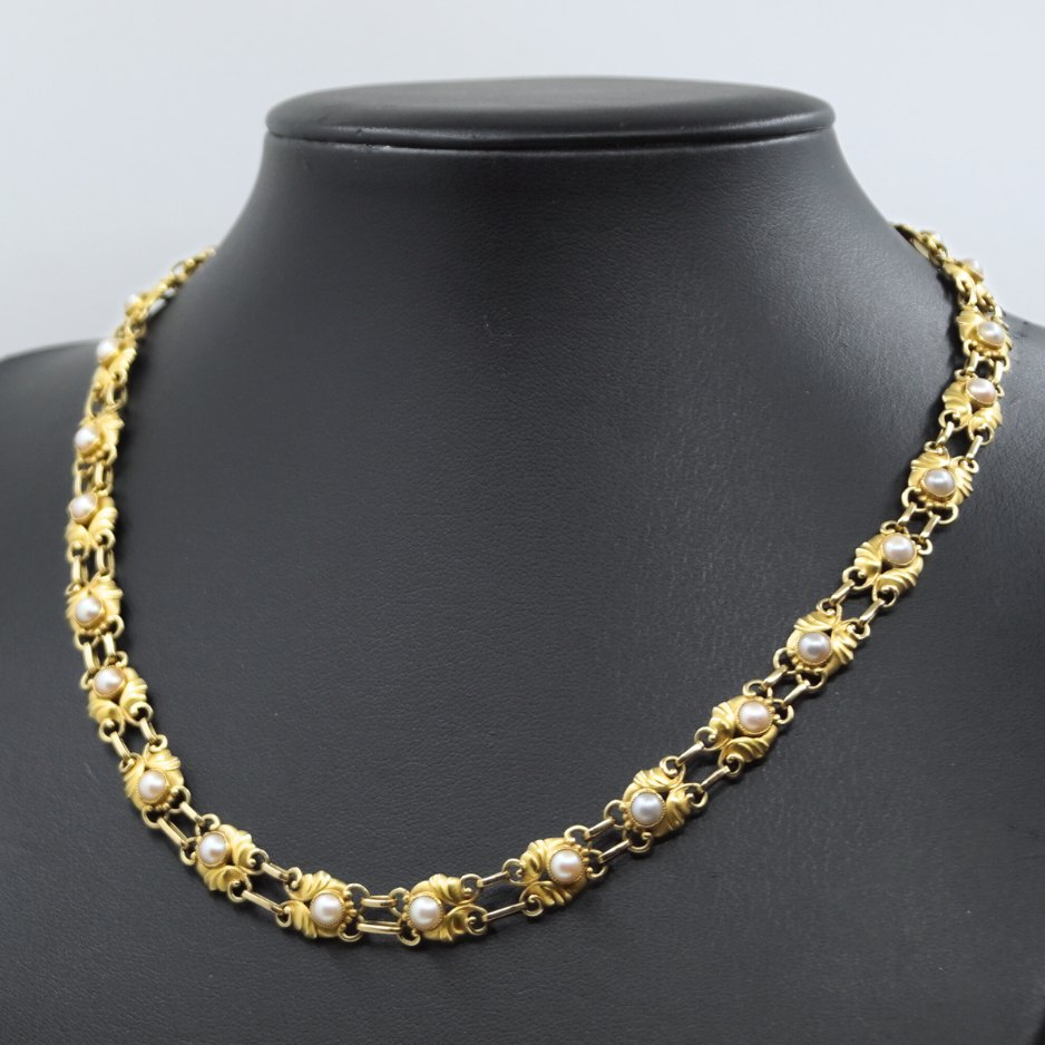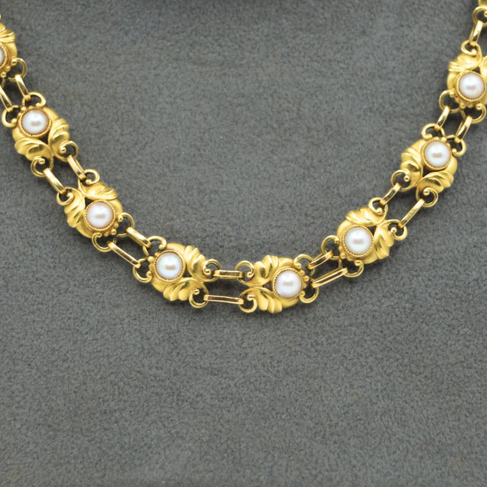 Leddelt halskæde i 18 kt. guld prydet med perler. Dessin nr. 249.