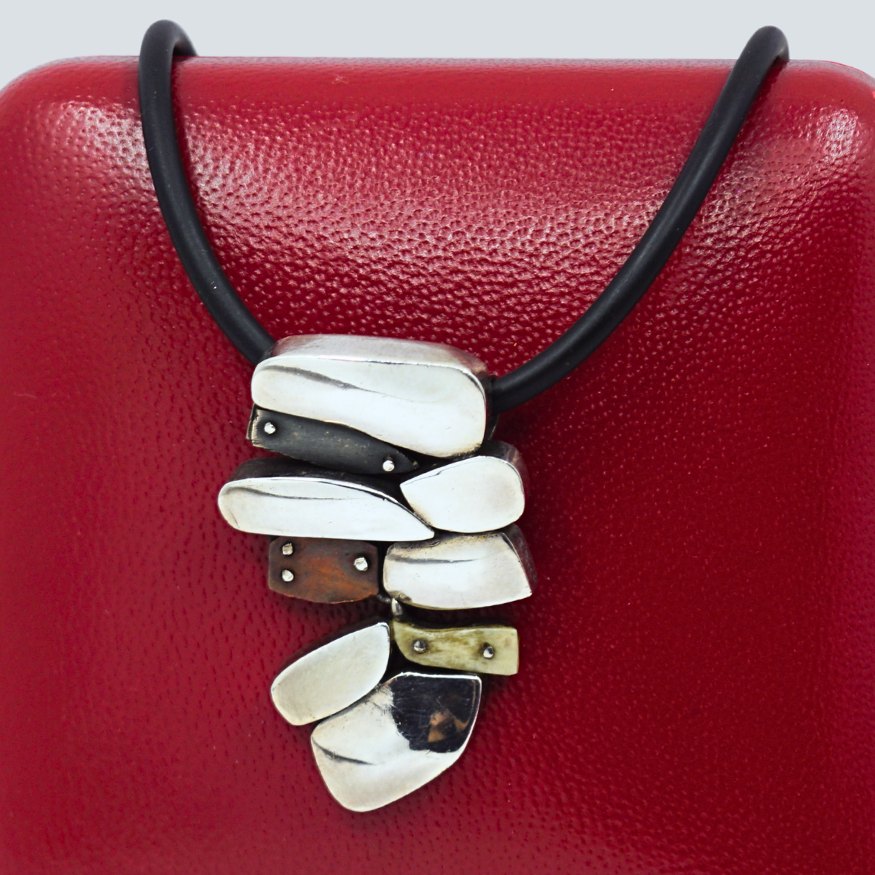 Anette Kræn; Vedhæng i sterling sølv. Isat en gummikæde med sølvlås. Den nederste del af vedhænget er bevægelig. Vedhæng h. 4,1 cm. B. 2,8 cm.