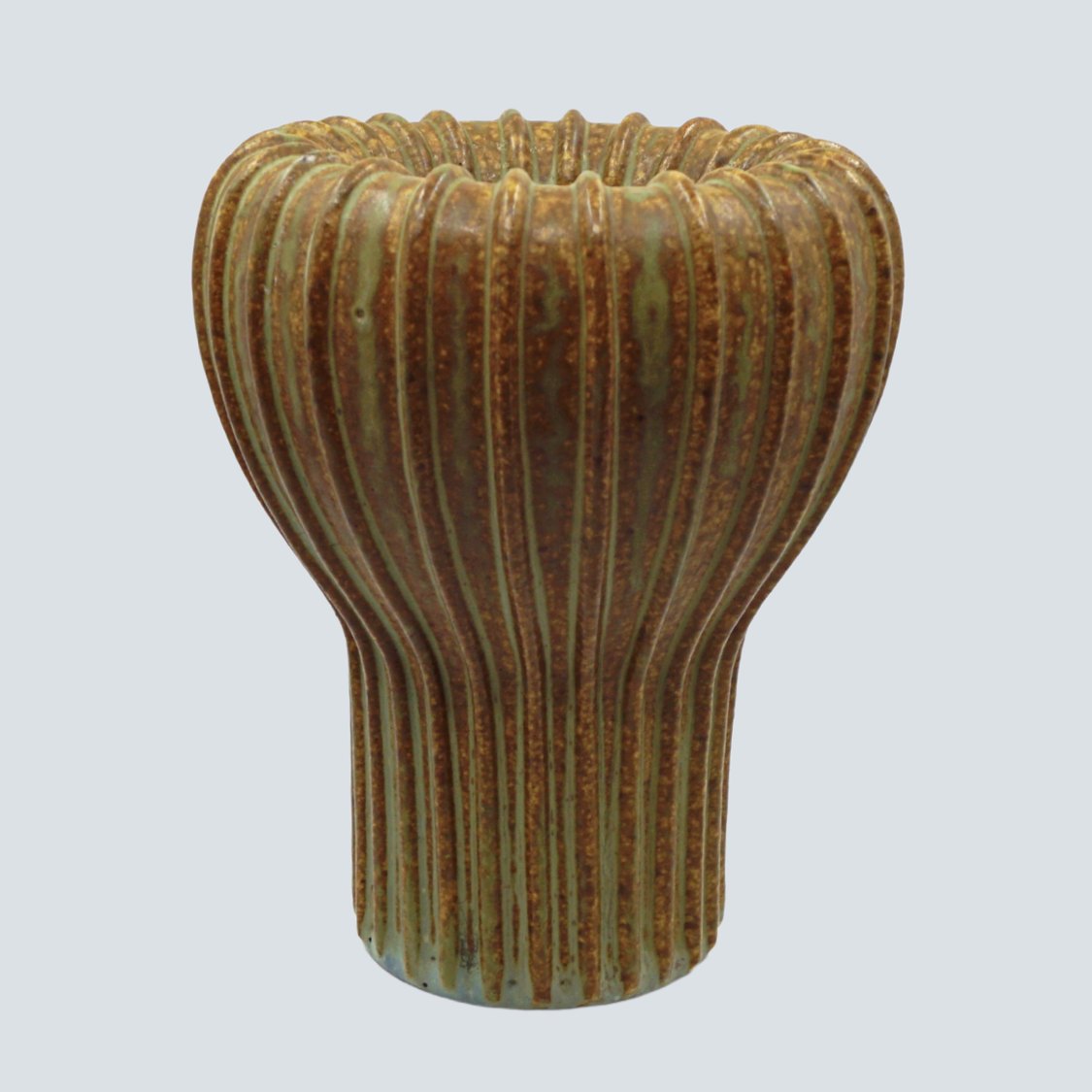 Arne Bang; Riflet vase af stentøj, nr. 139 Dekoreret med grønblå og brun glasur.
