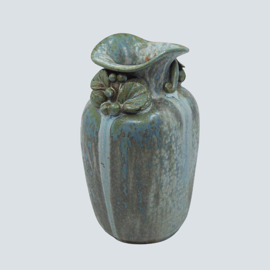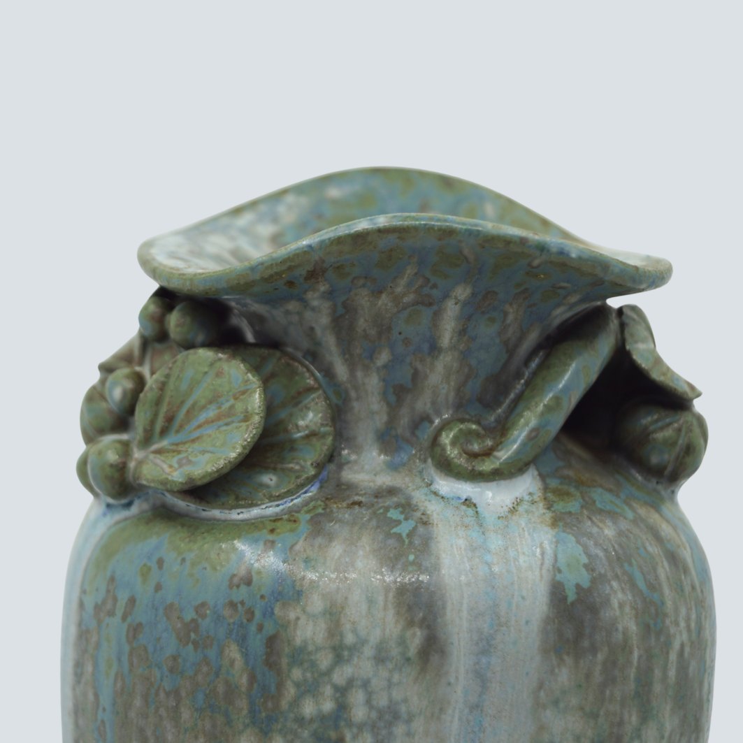 Arne Bang; Vase af stentøj, dekoreret med blomster. I blågrøn glasur. I god stand.