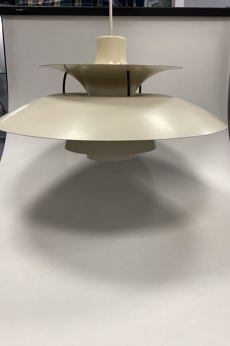 Poul Henningsen for Louis Poulsen Hvid pendel PH 5. Blå og rød inderskærm. Lille bule på den blå skærm, se foto. Måler 50 cm x 26,7 cm / 19,68 in. x 10,51 in.