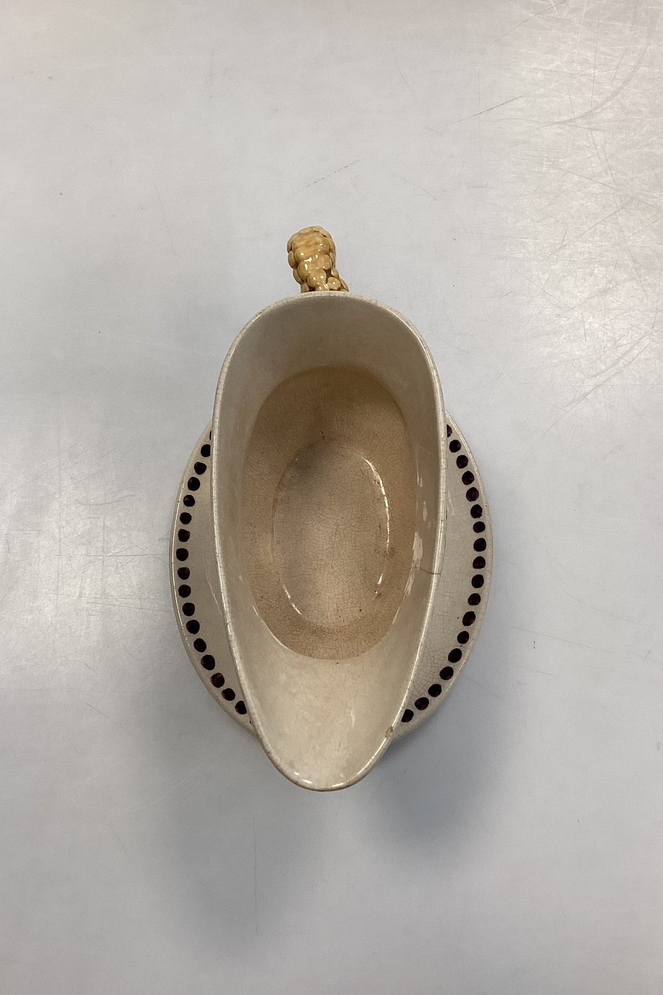 Aluminia Guldregn (Laburnum) Sauce Bowl with solid base No. 10/189. Cracks, hairline cracks and chipping on the edge, see photo. Designed by Harald Slott-Møller 1902.