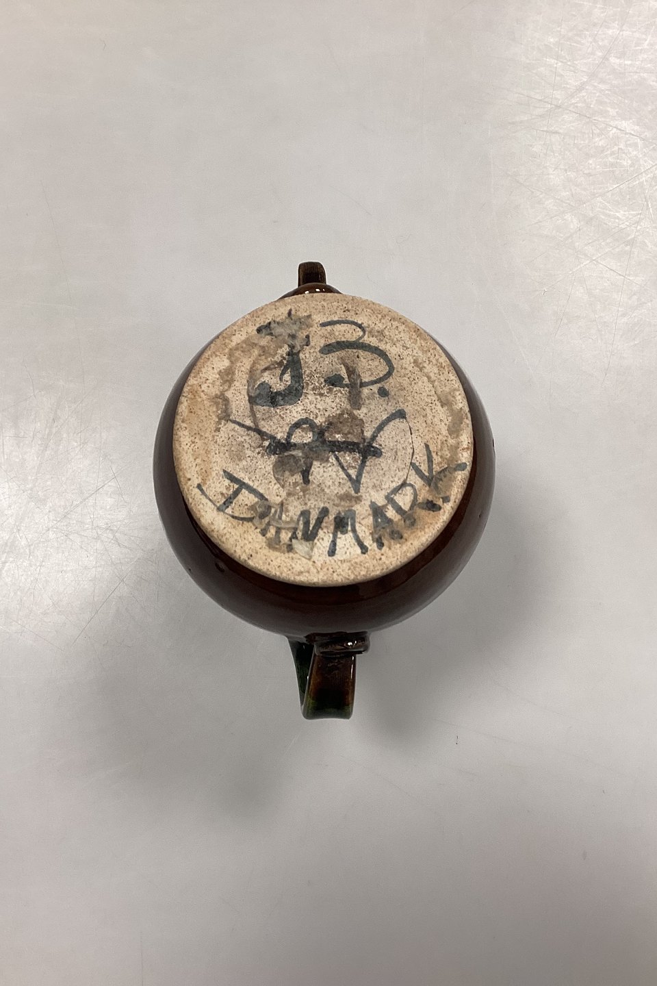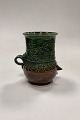 Bjørn Wiinblad Vase i glaseret Stentøj. Motiv med ansigt, hank og prægede stencilmønstre i brun og grøn glasur.
