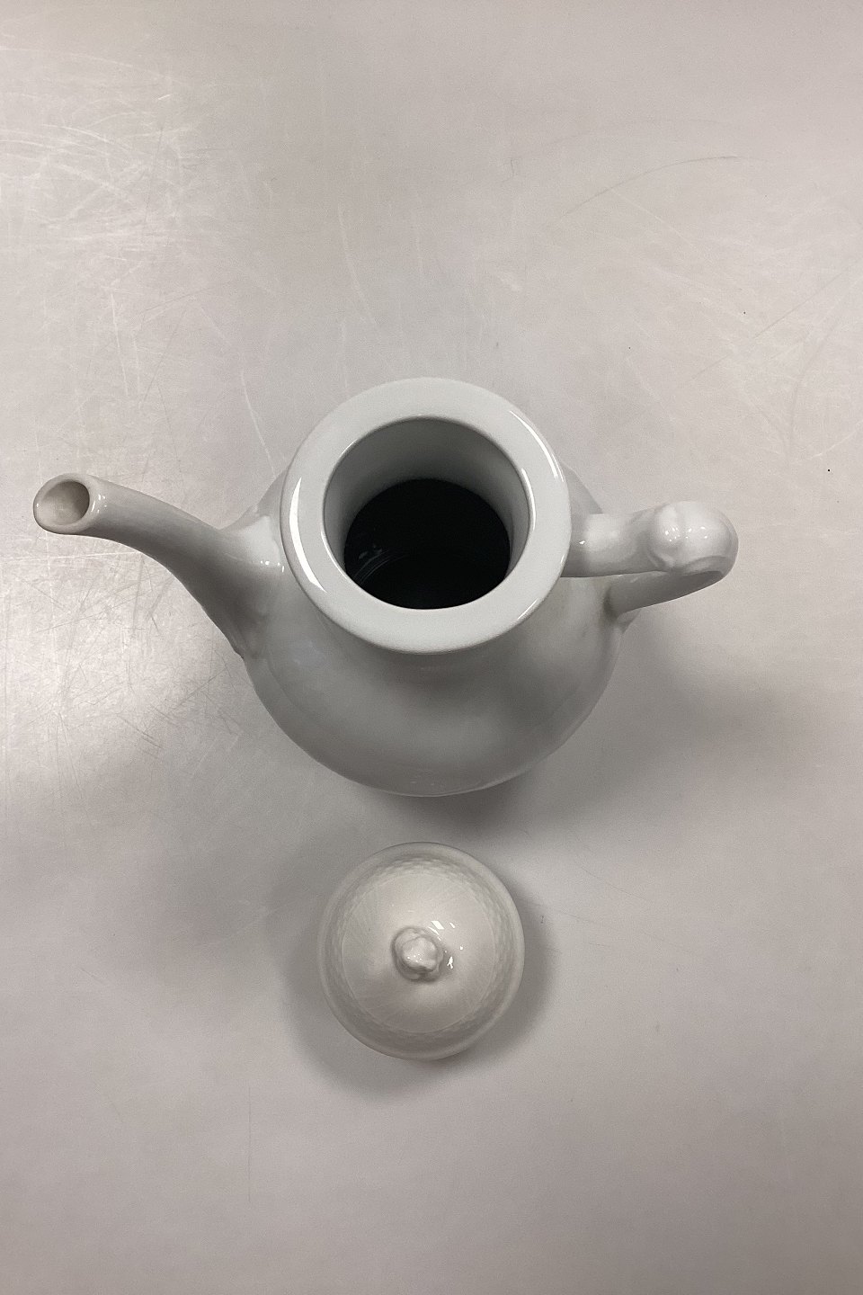 Royal Copenhagen Josephine, Hvid Svejfet Kaffekande No. 128 med låg No. 127. 1. Sortering.