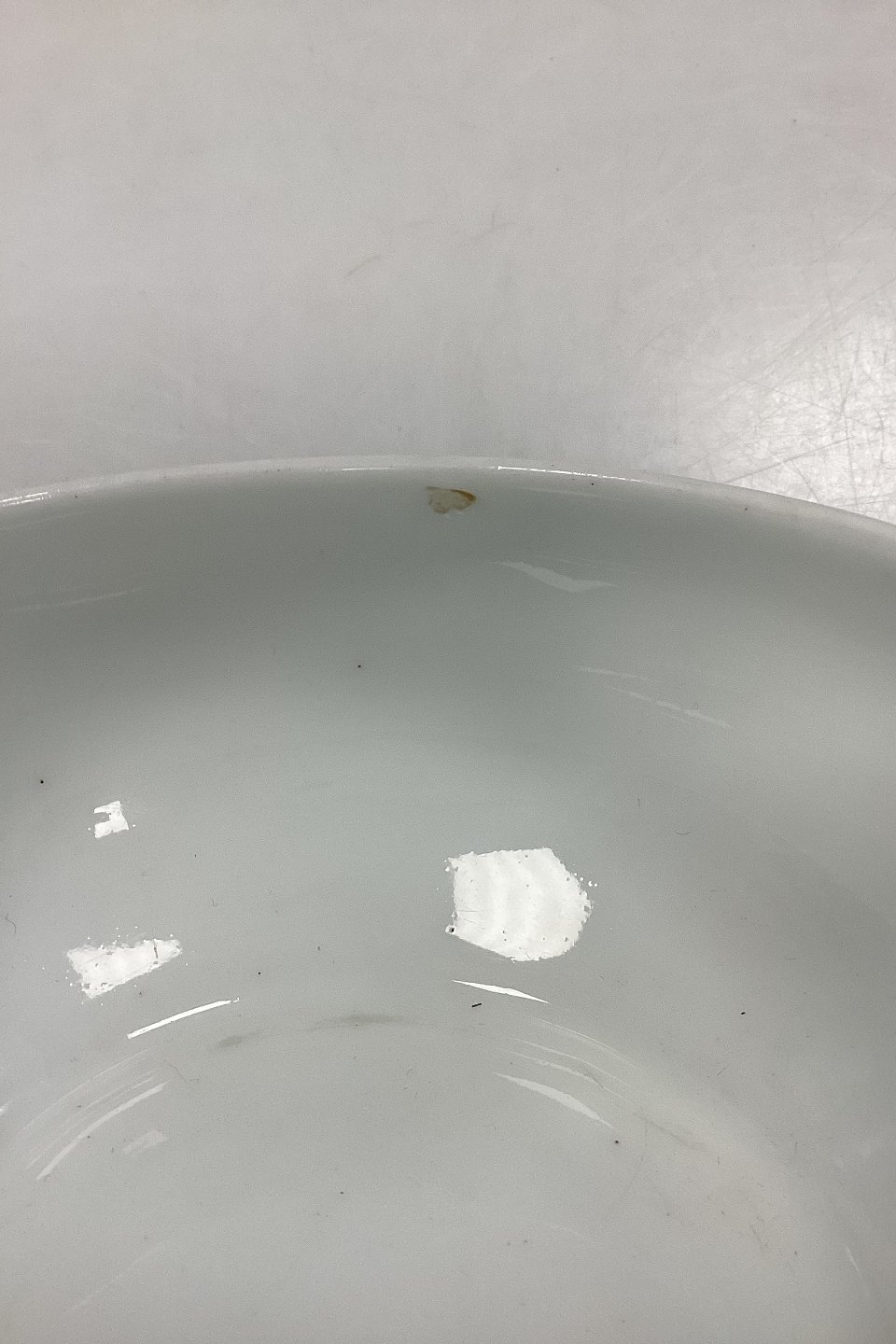 2nd Quality with small black firing chips and small glaze defect inside at top below the edge, see photo.