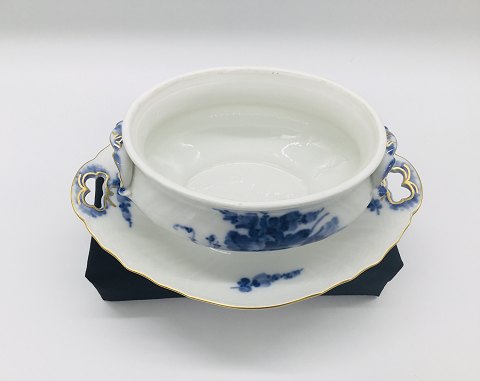 Royal Copenhagen, Blå Blomst svejfet med guld, sjælden sovsekande på fast underfad og Puttin figur på låget. Produceret 1968 1. sortering L 24 cm B 15,5 cm H 20,5 cm Perfekt stand og uden fejl.