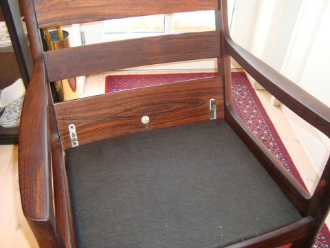 Fin gyngestol i palisander og med læderhynder, designet af Ole Wancher