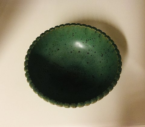 Arne Bang skål af stentøj med sølvplet låg, modelleret med riflet korpus, dekoreret m. grønlig fugleæg-glasur H 4,7 D 12,0