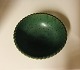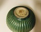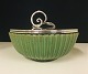 Arne Bang skål af stentøj med sølvplet låg, modelleret med riflet korpus, dekoreret m. grønlig fugleæg-glasur H 4,7 D 12,0