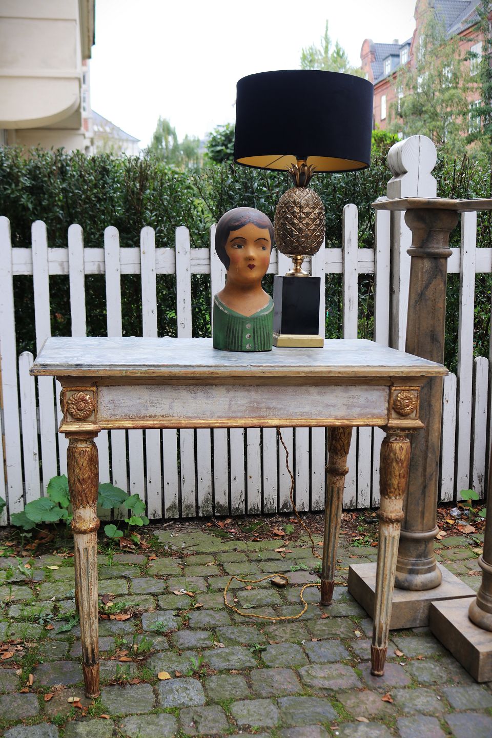 Antique Louis XVI console table with scraped original colour, gold-plated decorations and gray marbled top with a very fine patina.