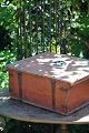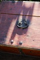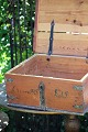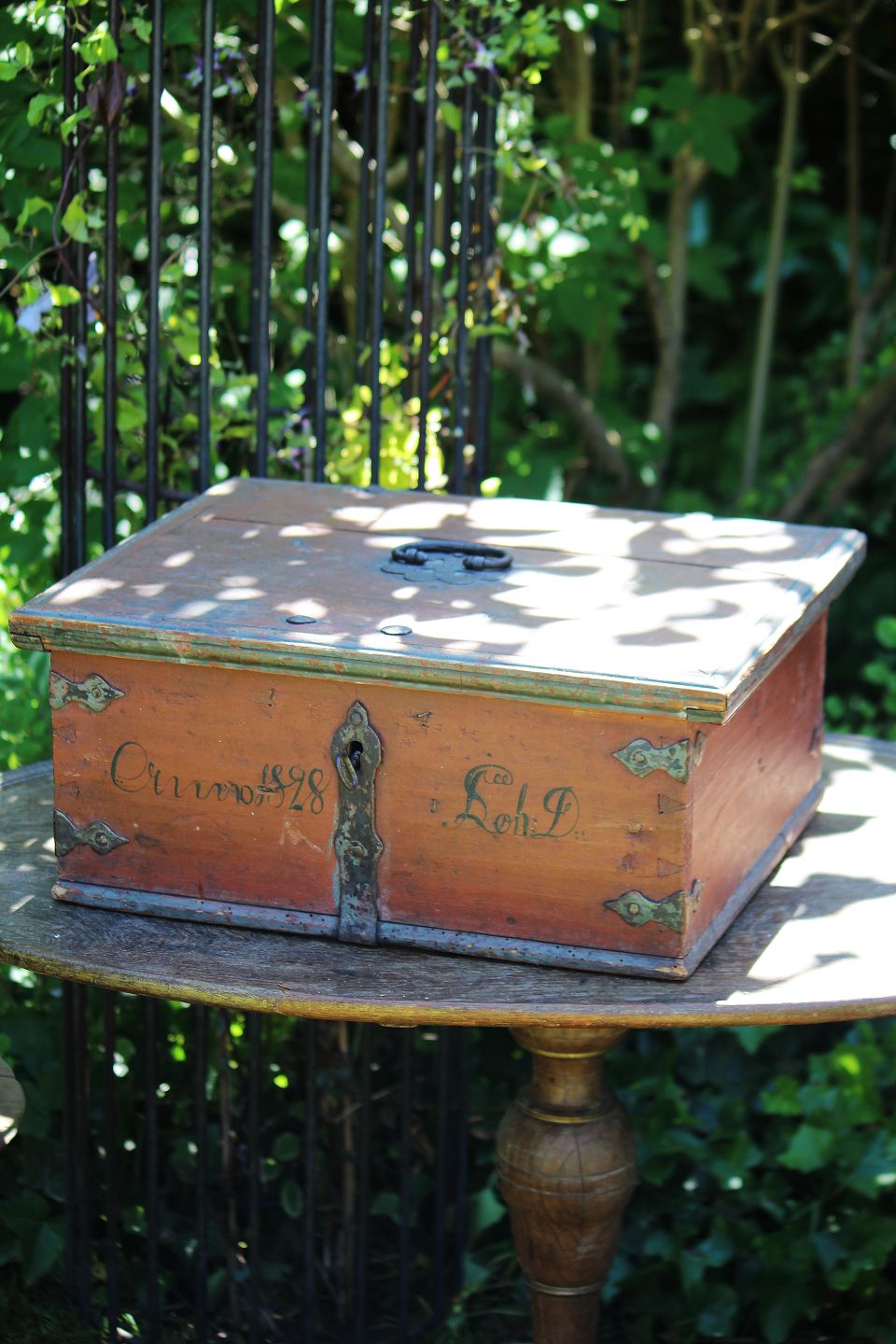 Svensk 1800 tals træ boks / skrin med original rød terrakotta farve med en rigtig fin patina , smedejerns beslag og med nøgle , dateret 1828.