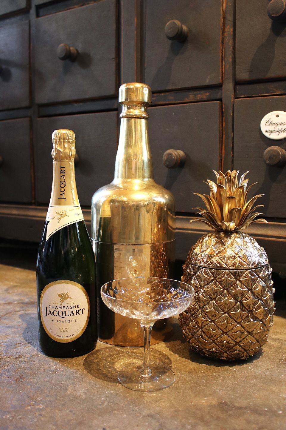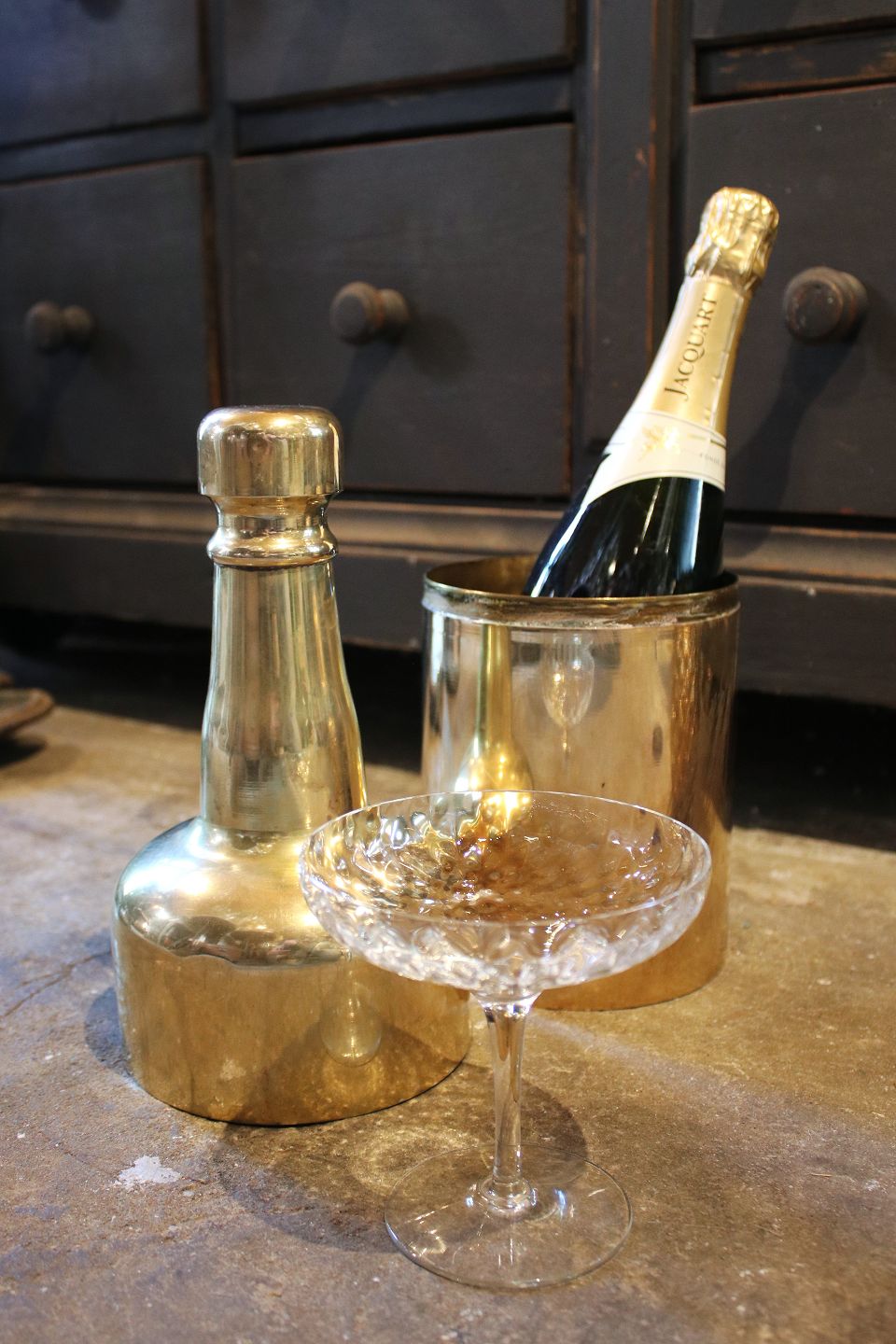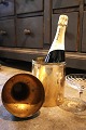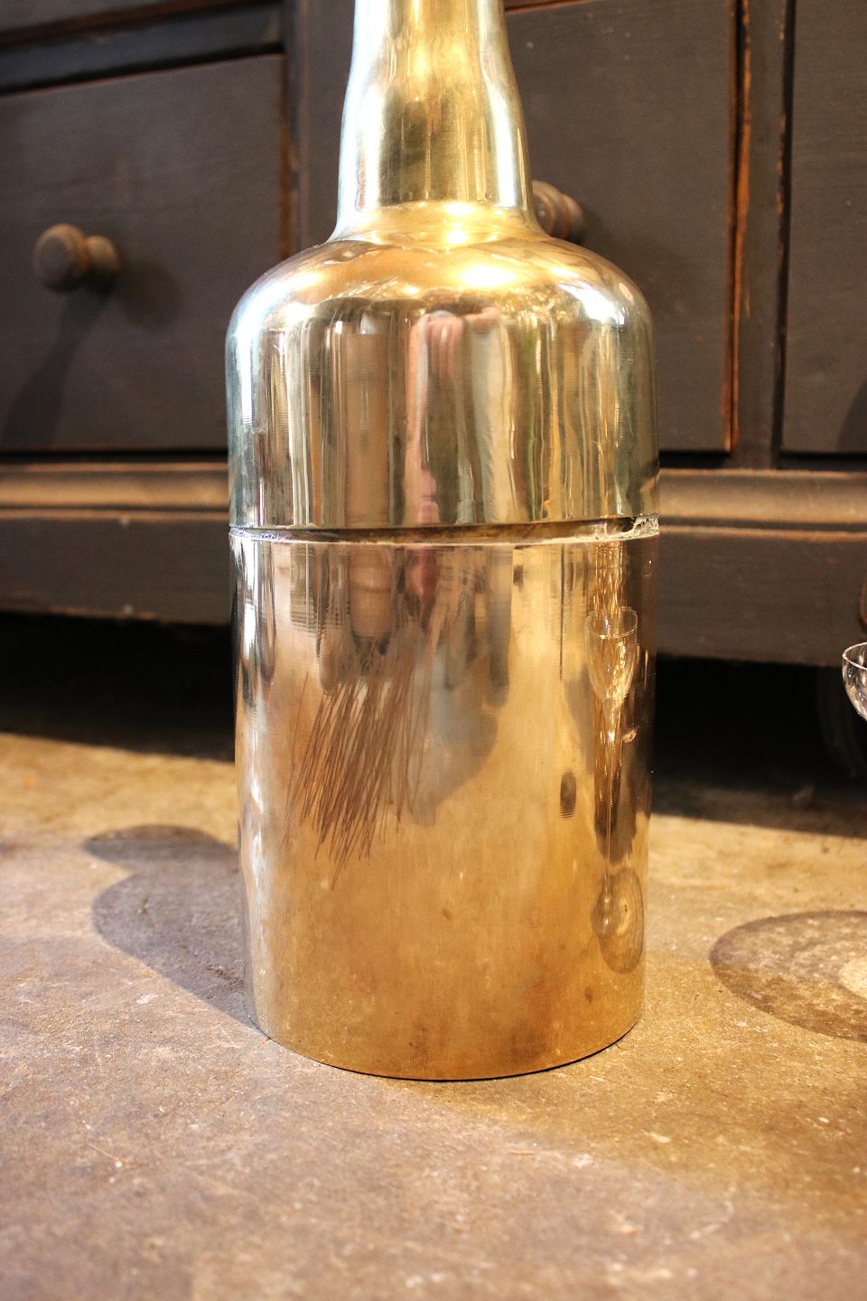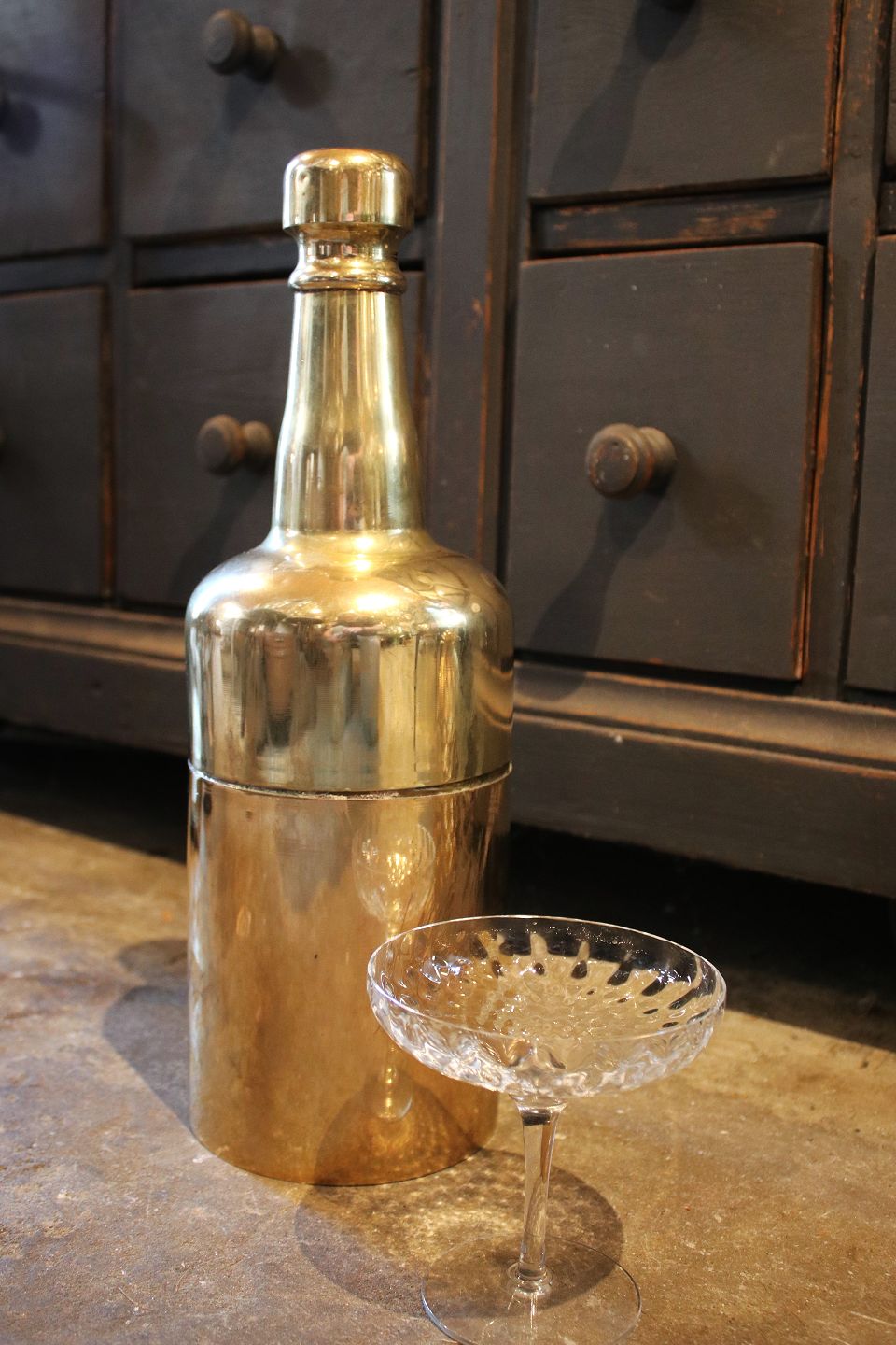 Gammel champagnekøler i form af stor flaske i messing som kan åbnes og fyldes med isterninger. Har brugs patina.