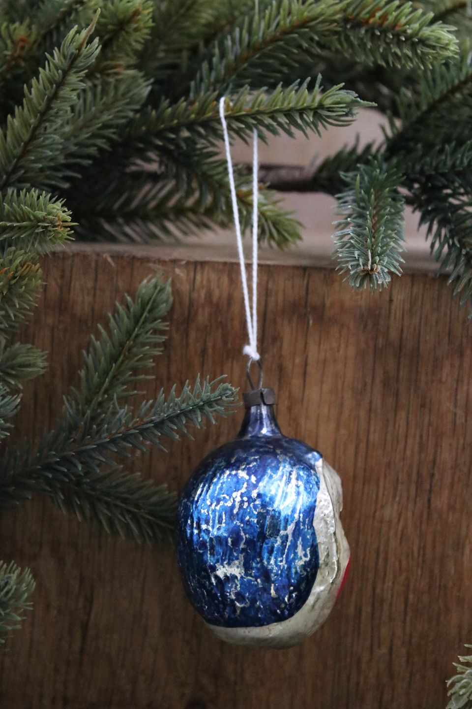 Gammelt juletræspynt i form af klovne hoved i bemalet glas fra 1930.