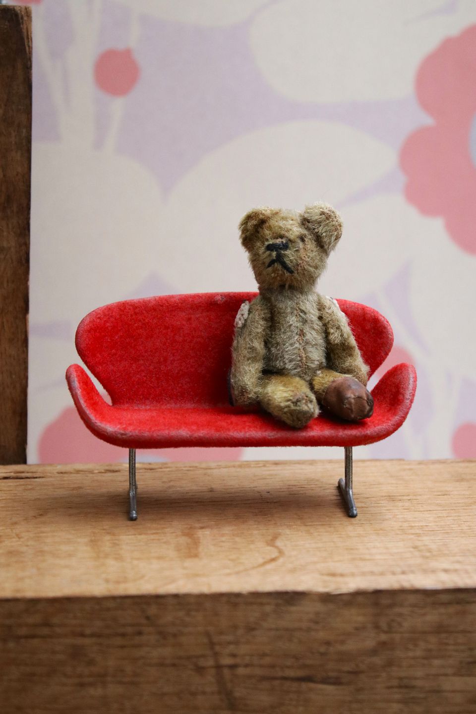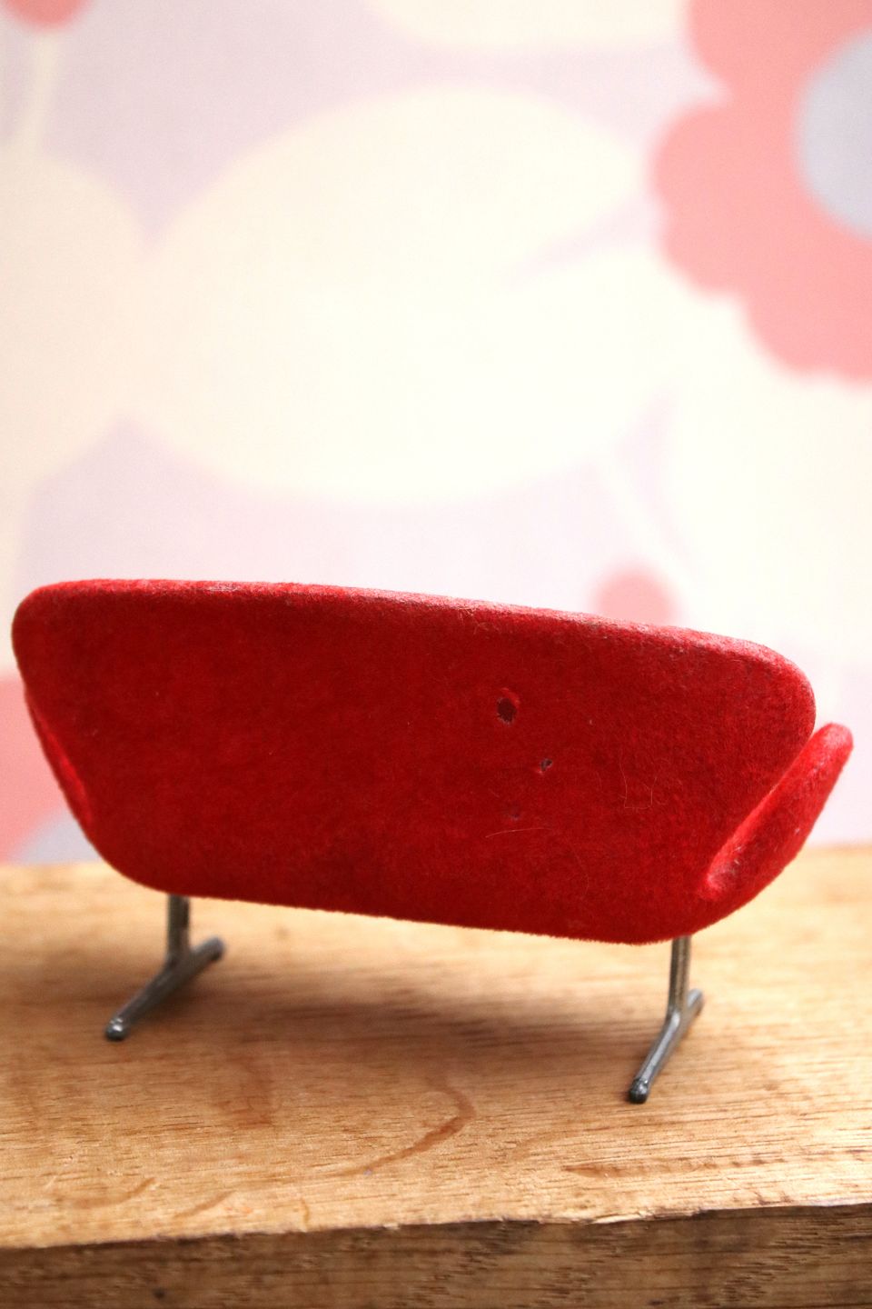 Svane sofa i rød velour , H: 6,6cm. L: 11cm. PRIS: 450 kr.