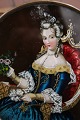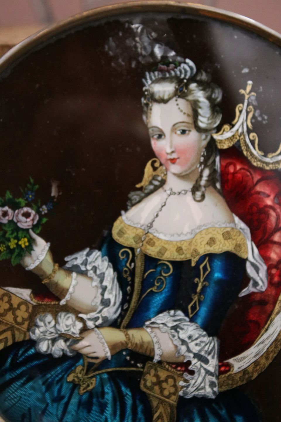 Dekorativ , fransk 1800 tals candy / slik æske lavet i pap med messing kanter og glasmaleri på toppen med motiv af fin fransk kvinde.