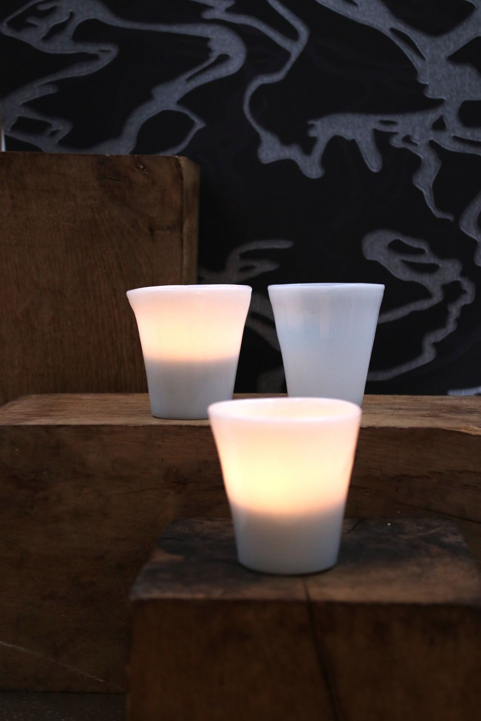 Gamle mundblæste lys glas i hvid opalglas til fyrfadslys. H: 6,5cm. Dia.: 6,5cm. Emne nummer: Lys glas