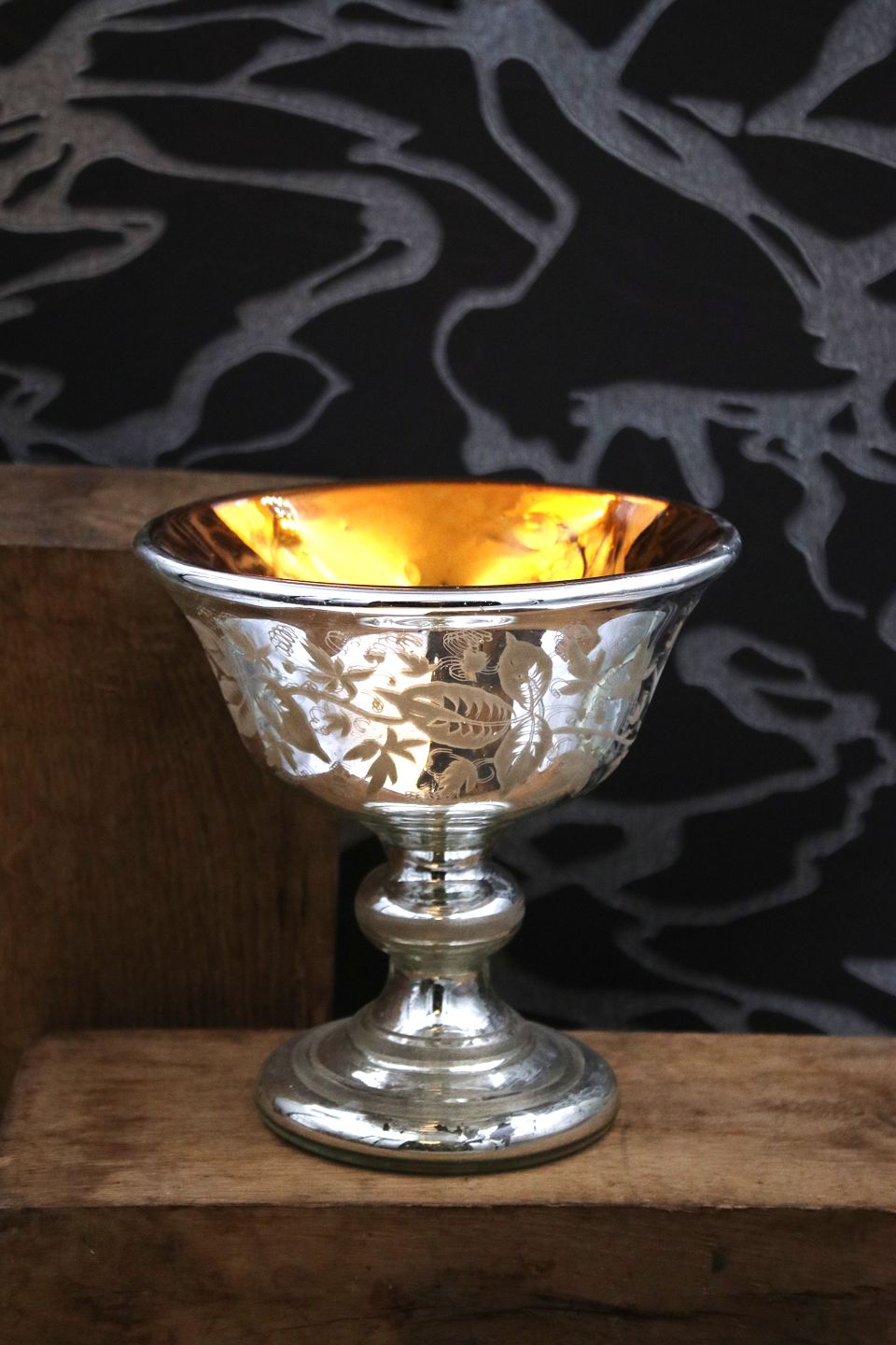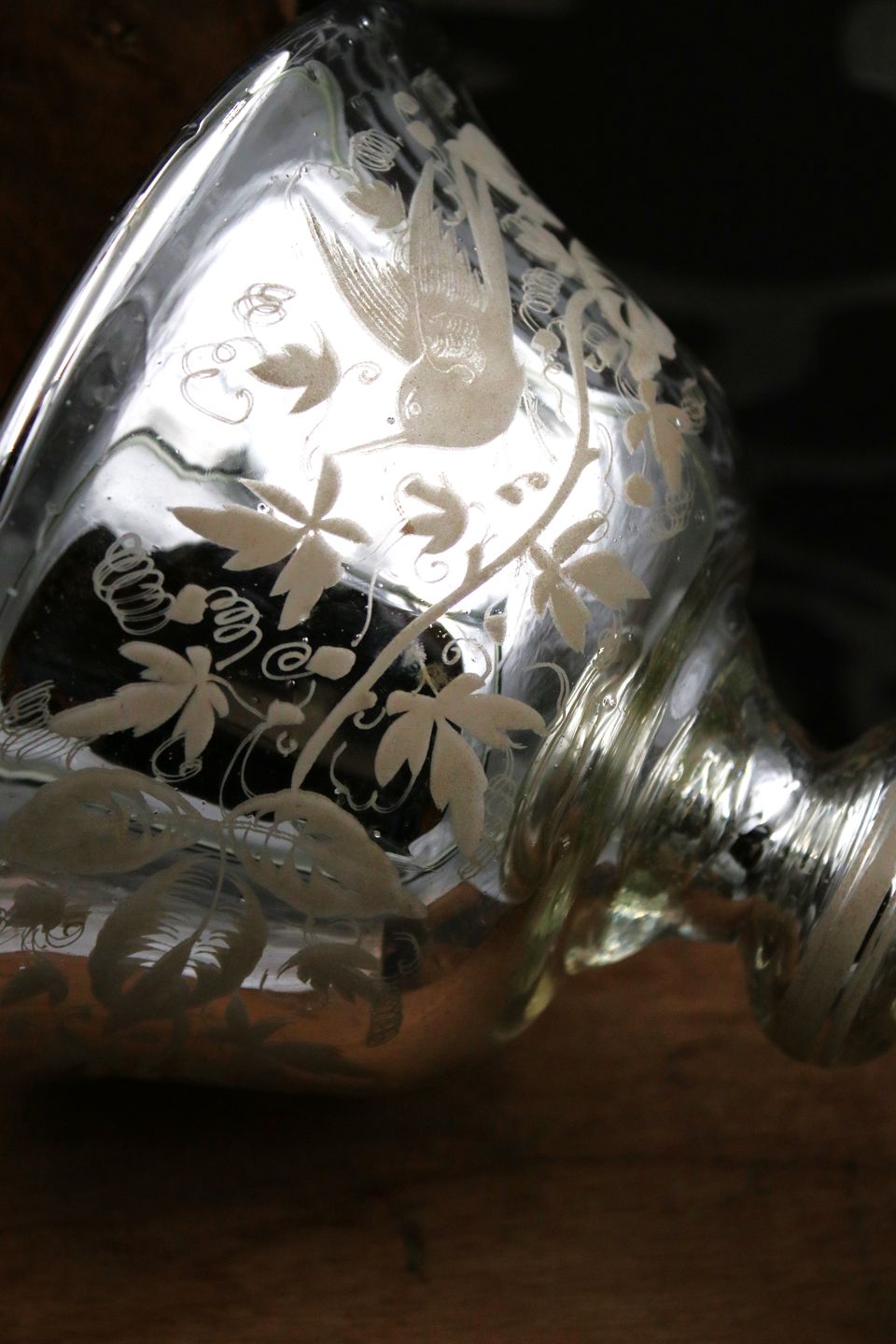 (Mercury silver glass) med fin ætset dekoration med fugle og bladranker Højde : 18cm. Dia.: 18cm.