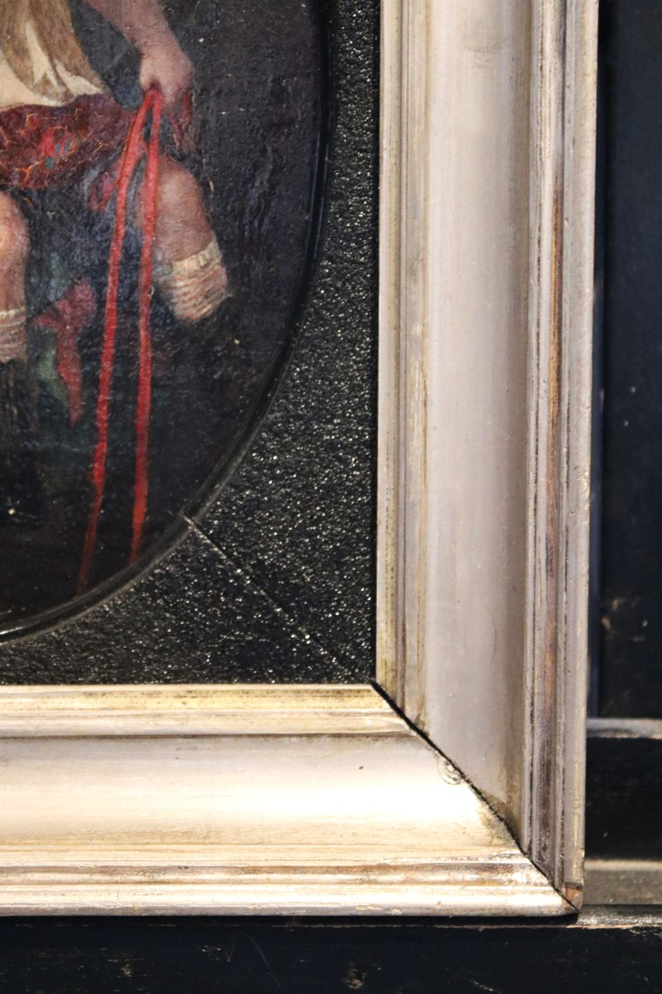 Decorative 19th century oil painting painted on wood with a motif of 2 children sitting on a chair...