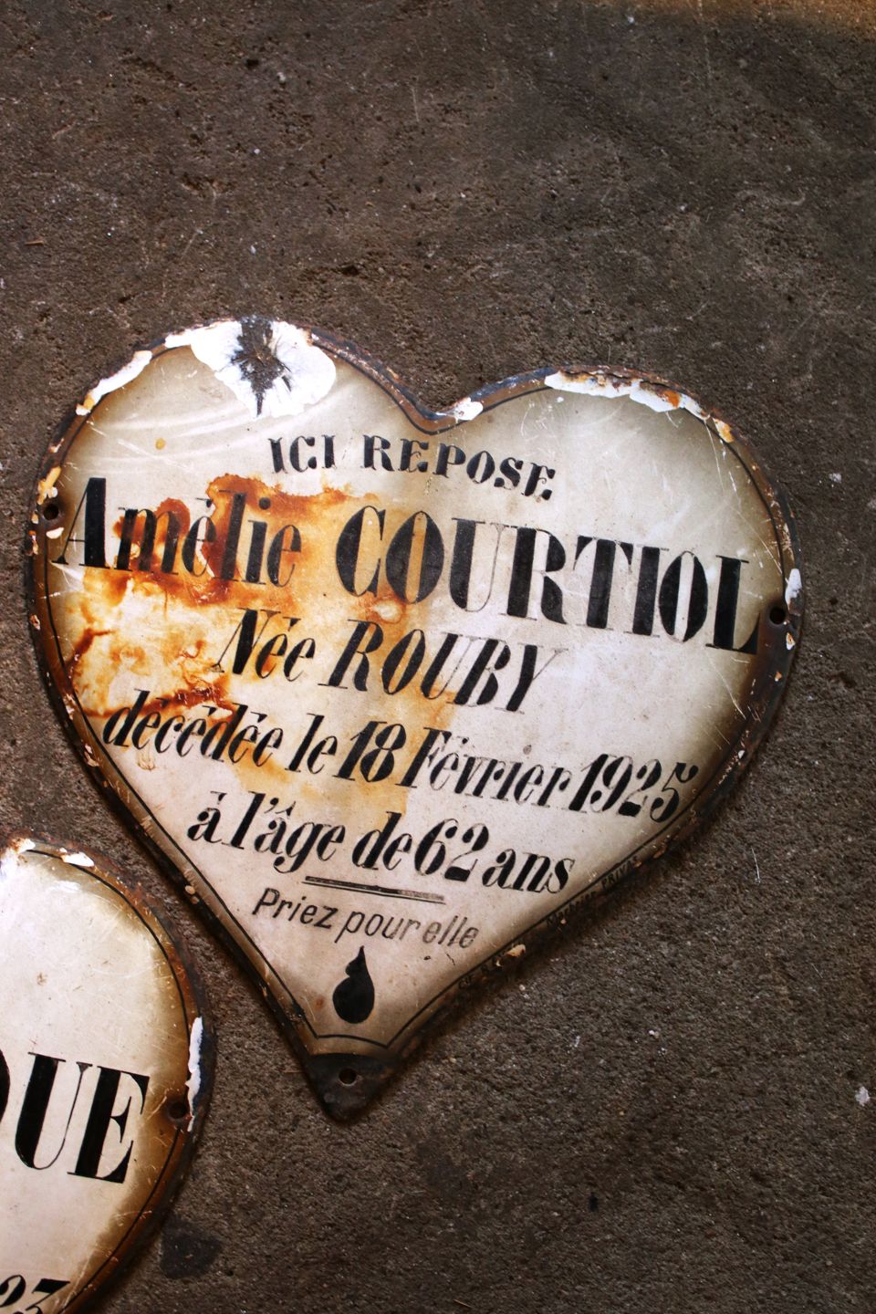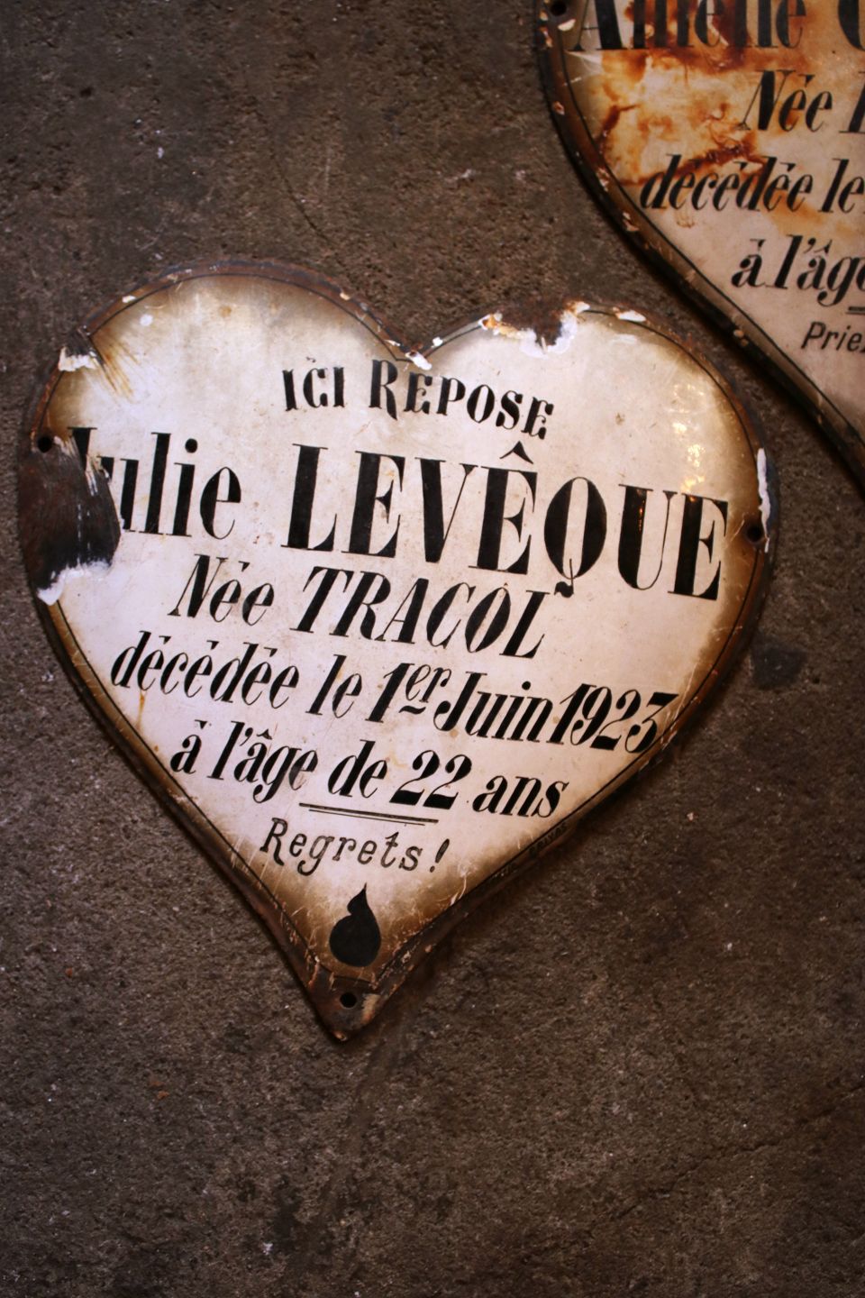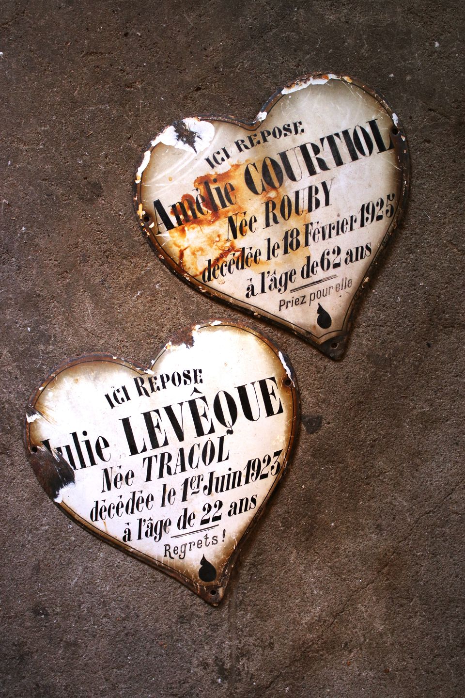 Dekorative , gamle franske minde hjerter i jern og emalje med skrift med patina tilbage fra år 1923 / 1925.