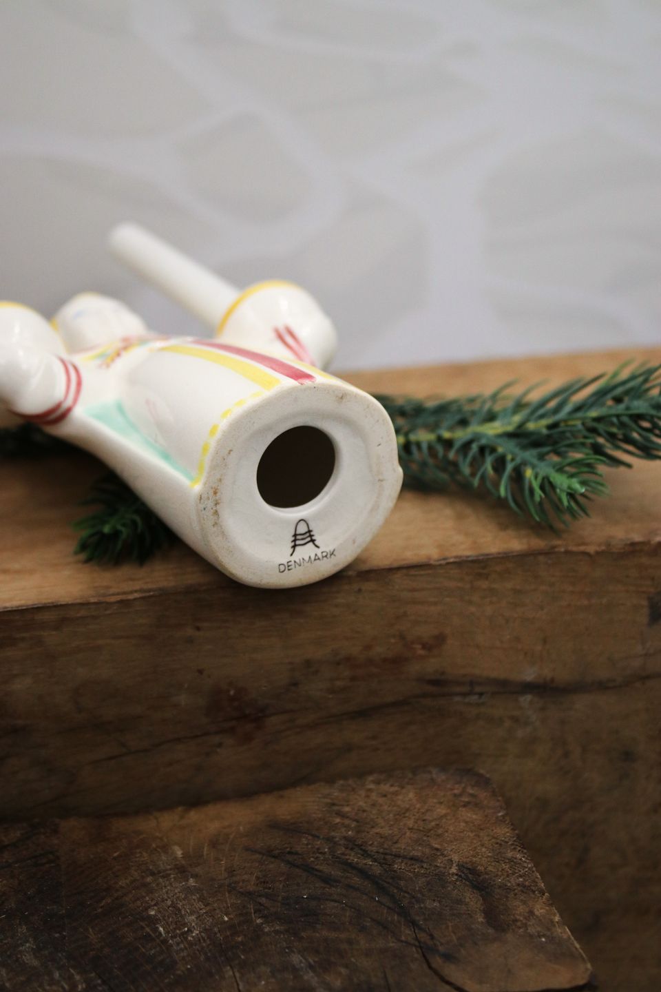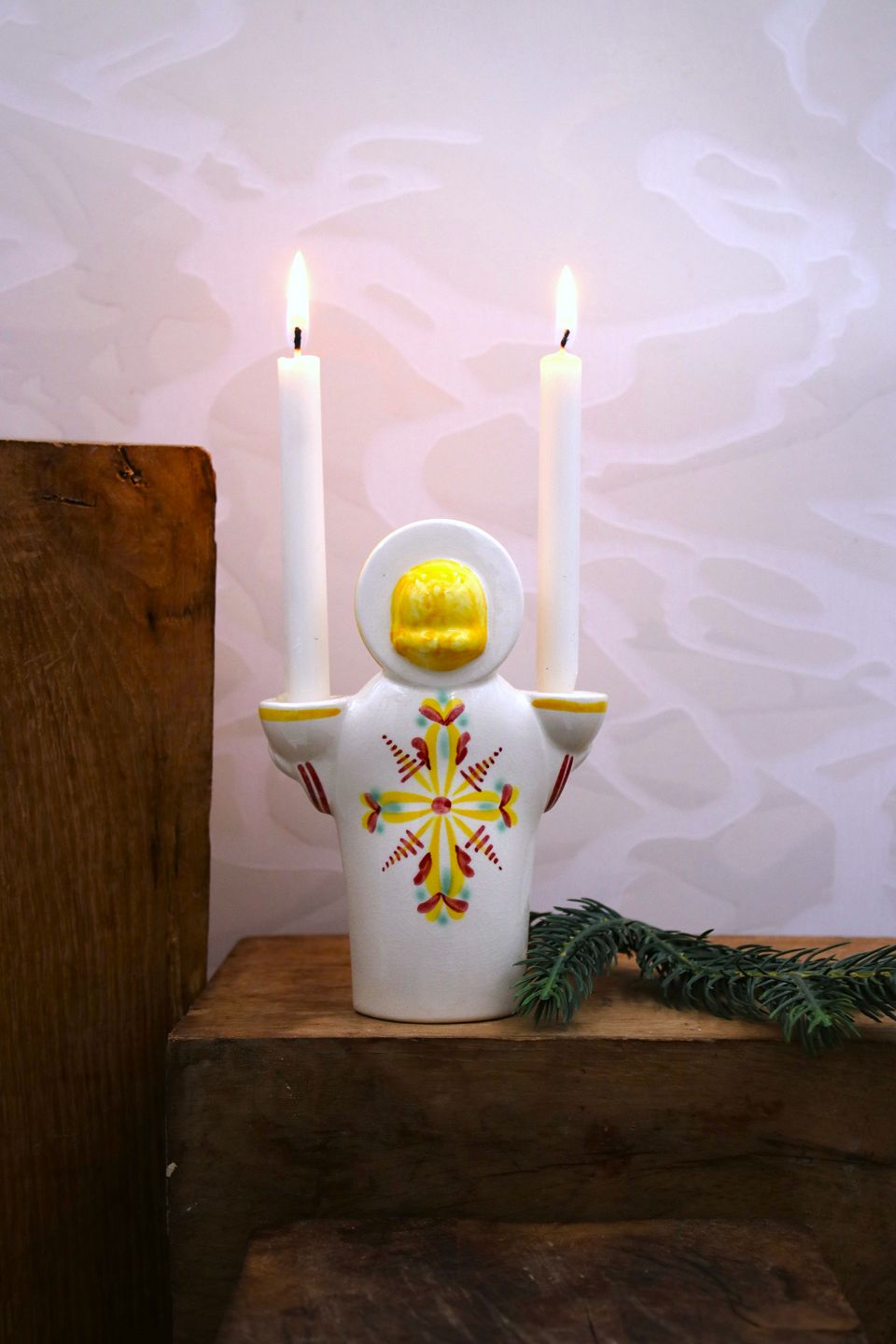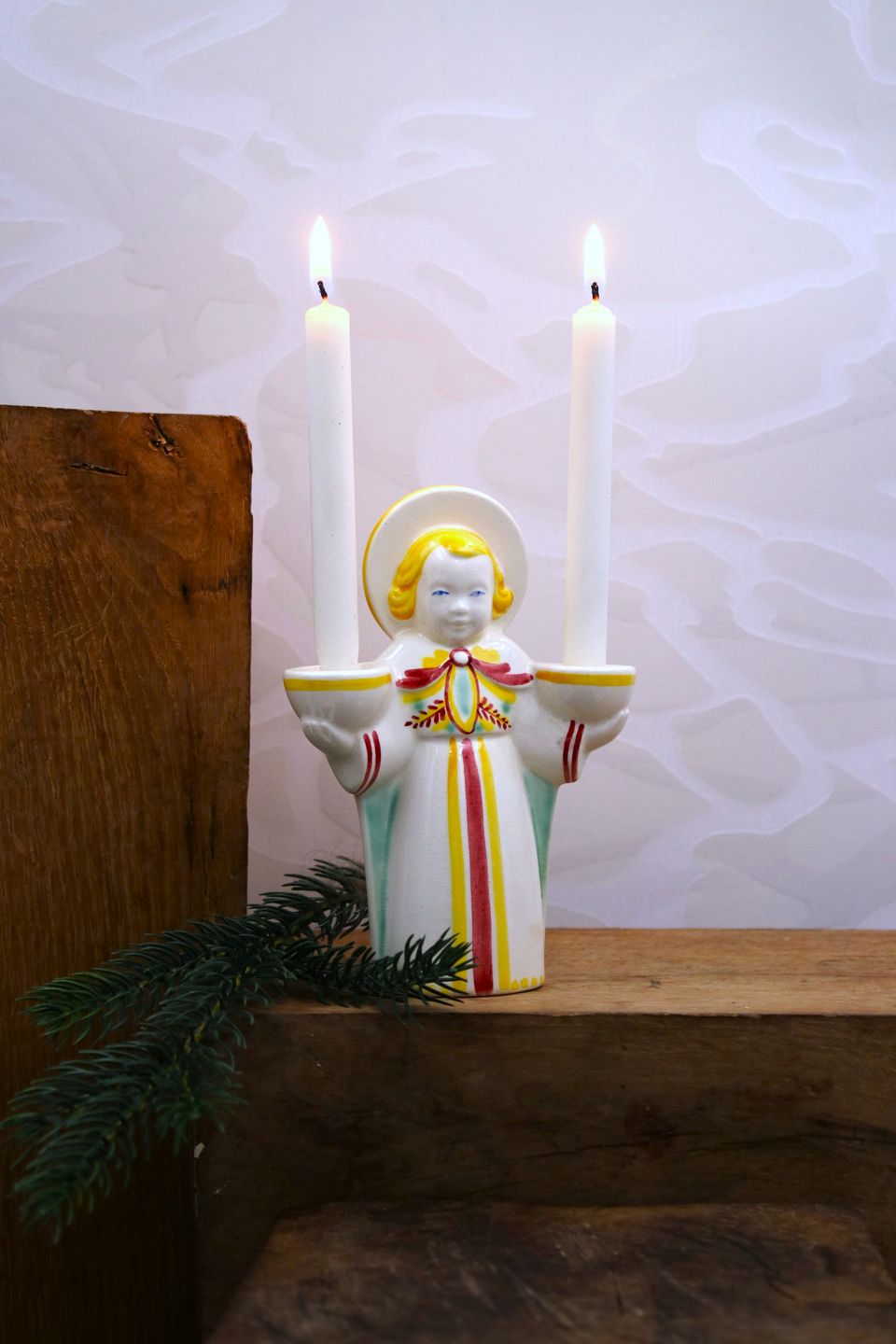 Aluminia fajance jule engel der bære 2 små stearinlys. Højde: 13,5cm. Emne nummer: Aluminia jule engel