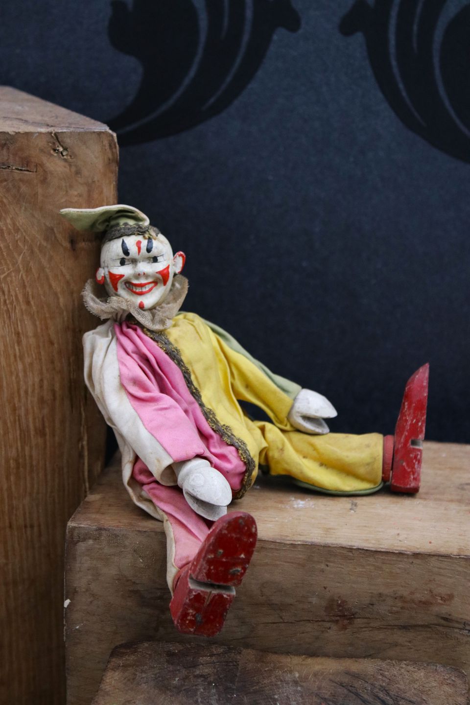 Klovnen har en rigtig fin patina , har bevægelige arme og ben.