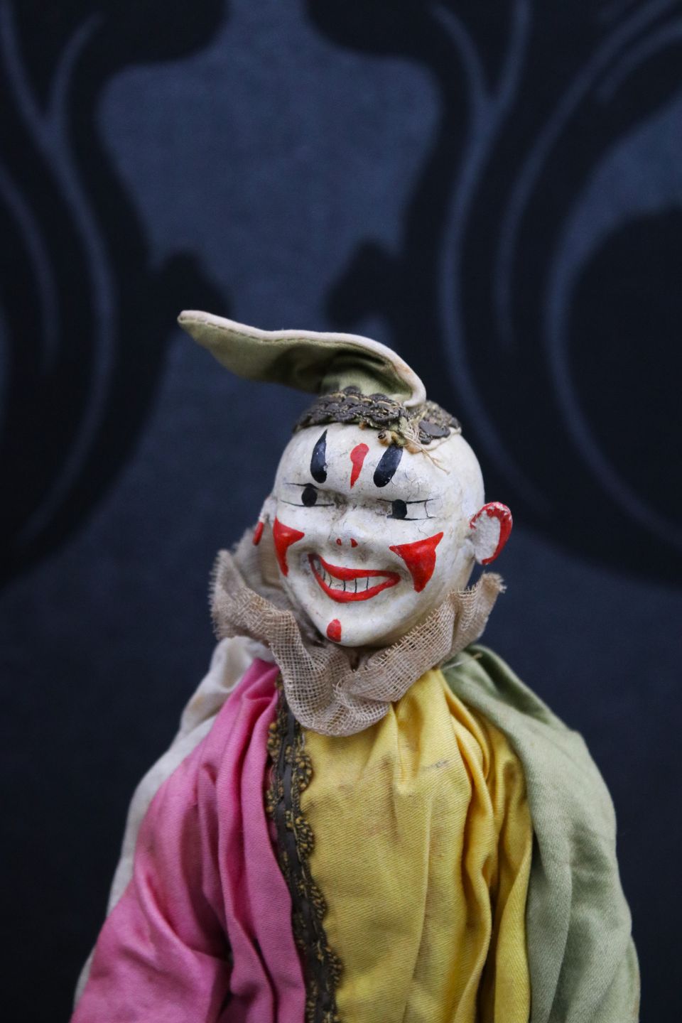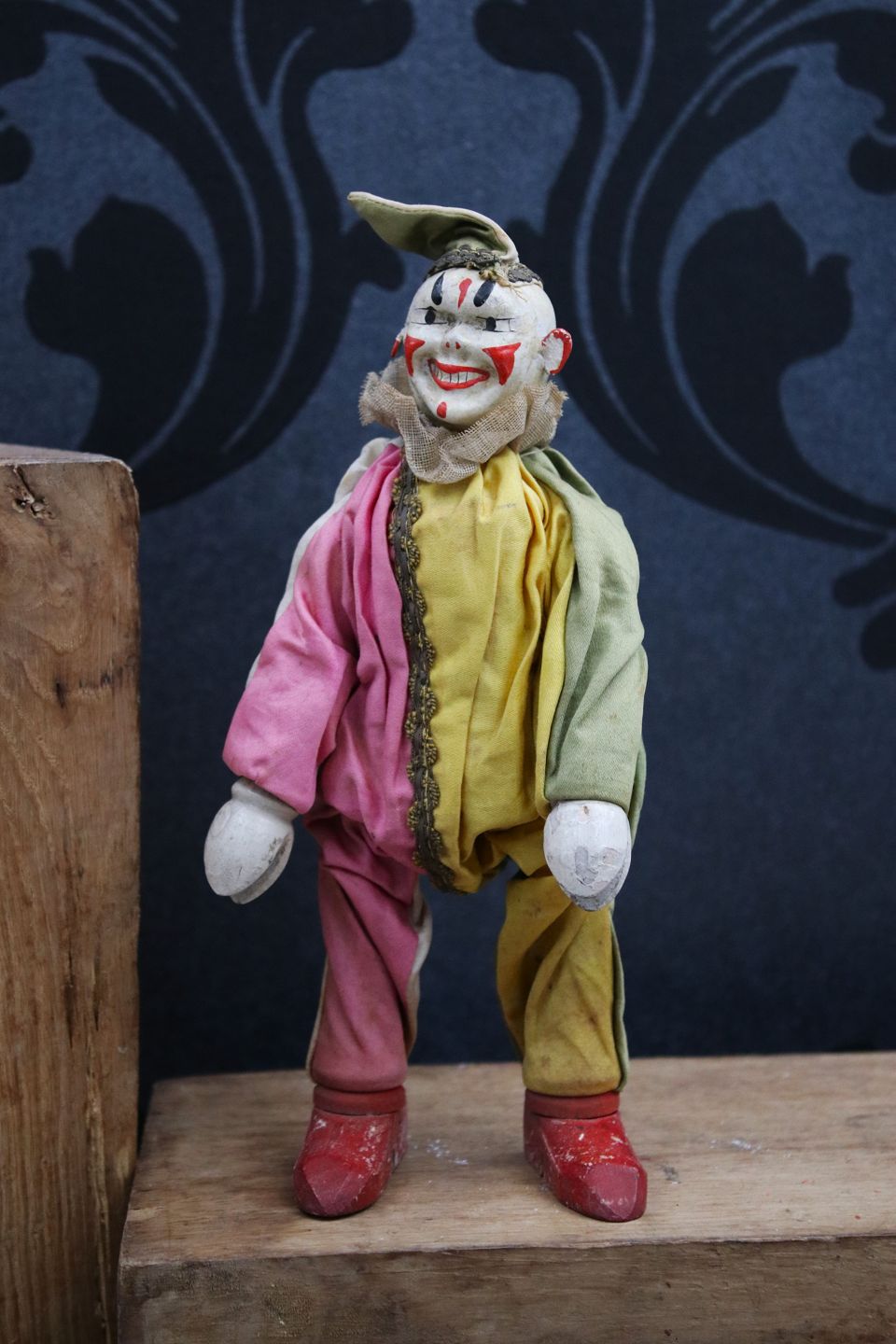 Dekorativ , sjov cirkus klovn fra omkring 1910 i udskåret træ med bemalet ansigt og fint klovnetøj i stof.