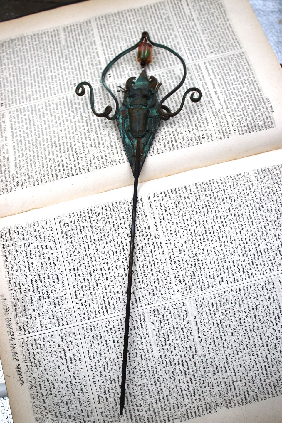Unique flower stick in copper with glass bead and insect made by jewelry artist Torben Hardenberg. Height: 31cm. Item number: Torben Hardenberg 1
