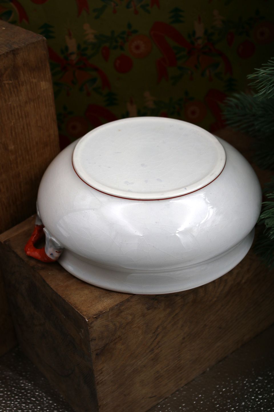 Old Swedish Christmas bowl in faience with a gnome on the handles. H: 7.5 cm. Dia.: 20cm. Item number: Svensk juleskål