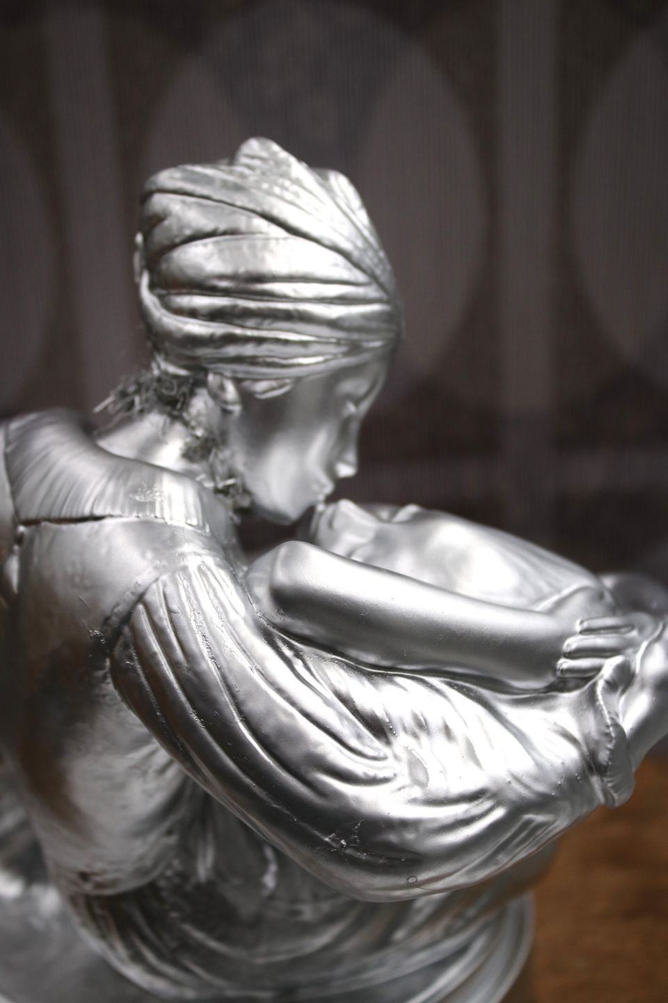 The head of the man has been glued to the neck and the figure has then been spray painted in silver chrome color.