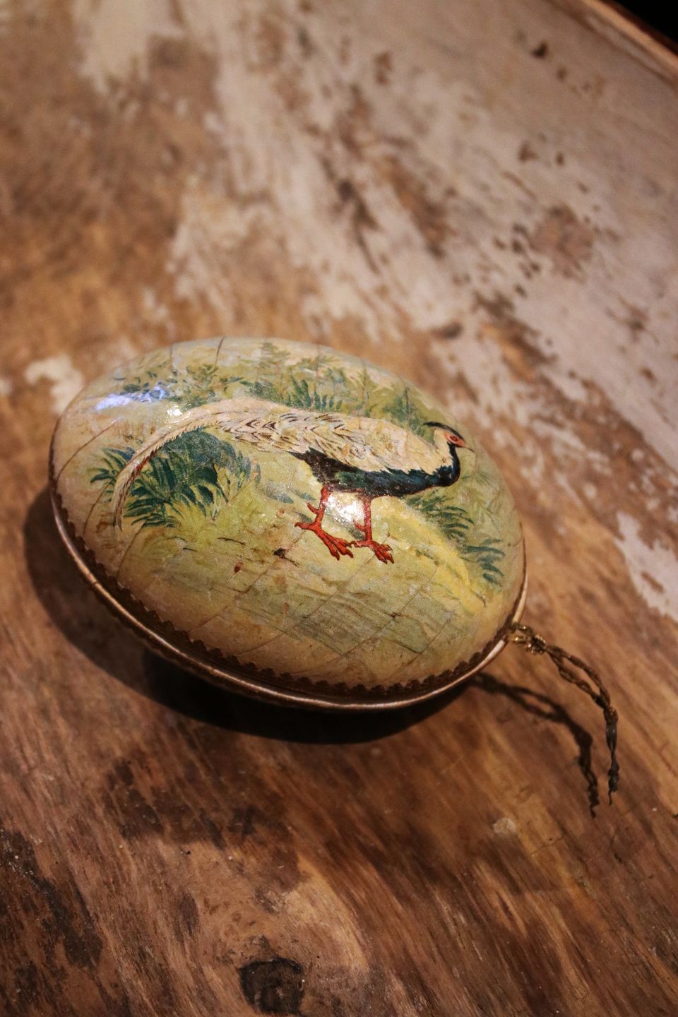 Gammelt påskeæg i træ med bemalet påfugle