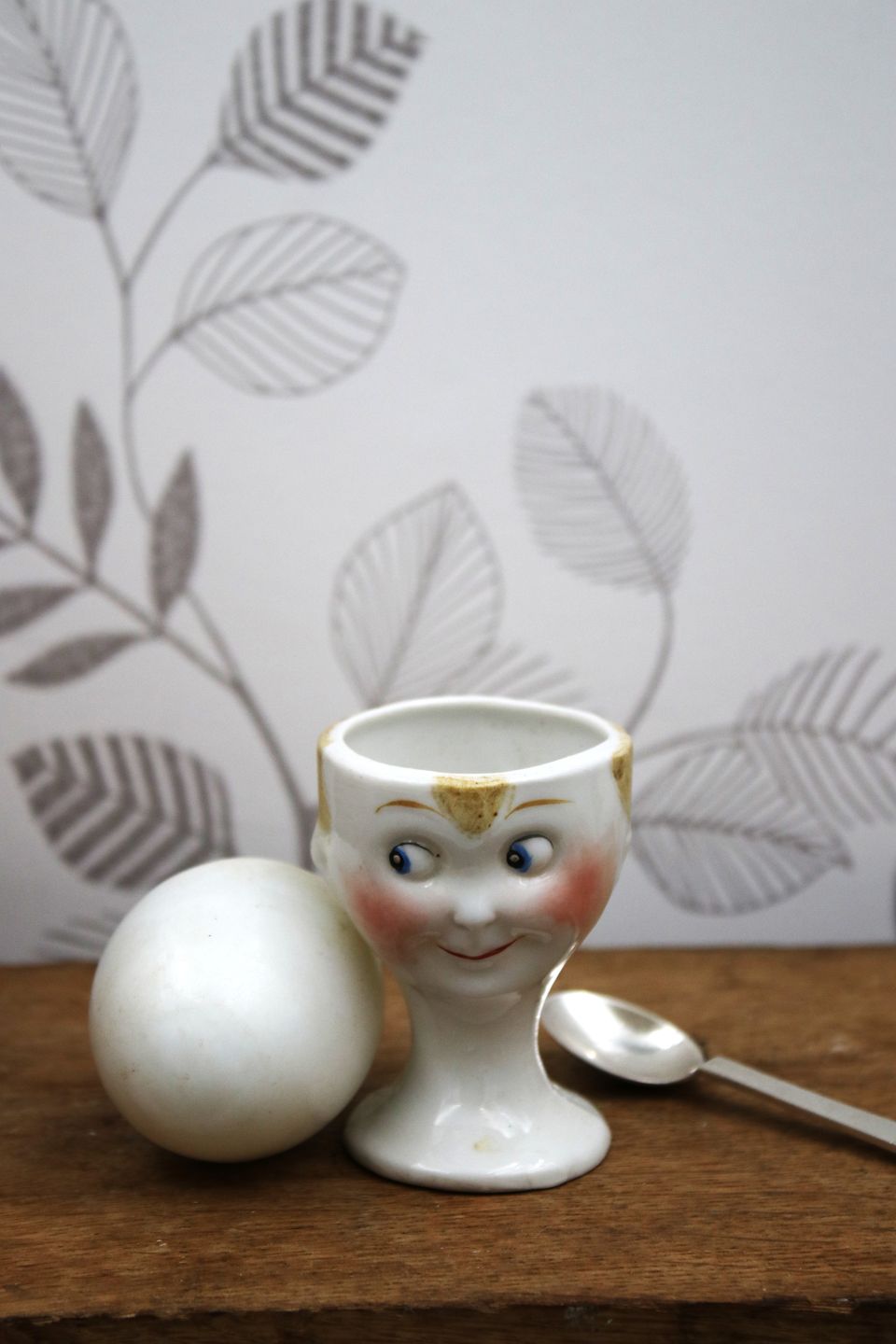 Gammelt æggebægre fra 30érne i porcelæn med bemalet sjovt ansigt. Højde: 6,5cm. Emne nummer: Æggebægre nr.10