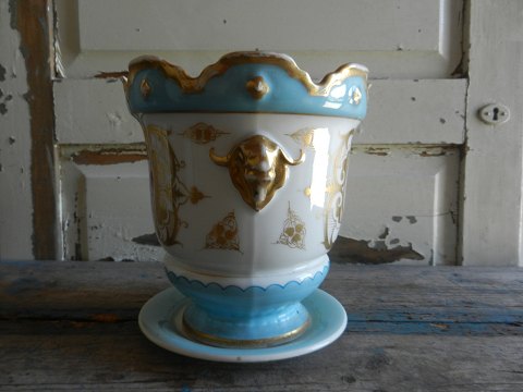 Meget smuk fransk urtepotteskjuler i turkis og guld, med håndmalede blomster dekorationer, bemærk de smukke vædderhoveder! Potten er fra midten af 1800tallet.
