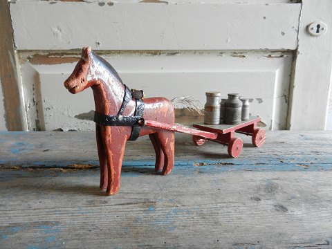 Mål på hesten: længde 13cm. Højde 15cm. Længde incl. vogn 32cm.