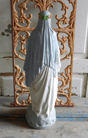 Meget smuk Madonna figur i gips, med flot bemaling i sarte farver. Fremstår med smuk patina. Højde 50cm.