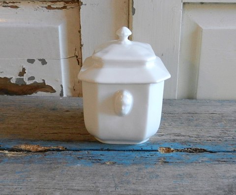 Fransk 1800tals sukker skrin i hvidt porcelæn med maskaroner på siderne.