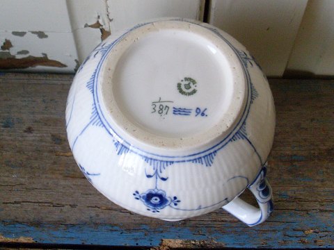 Royal Copenhagen, Sjælden musselmalet riflet kande No. 387, 1.sort. Højde 17cm. Produceret mellem 1898-1923