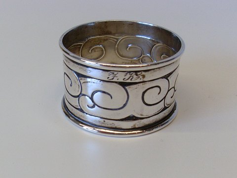 Servietring med skønvirke dekoration Stemplet de tre tårne 1910. Fremstår med ejerinitialer JK Diameter 4,8cm. Højde 2,8cm.