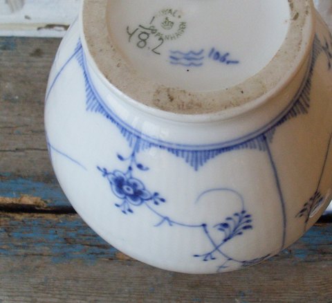Royal Copenhagen Musselmalet riflet chokoladekande med låg No. 482, 1. sort. Højde 23cm. Produceret mellem 1898-1923