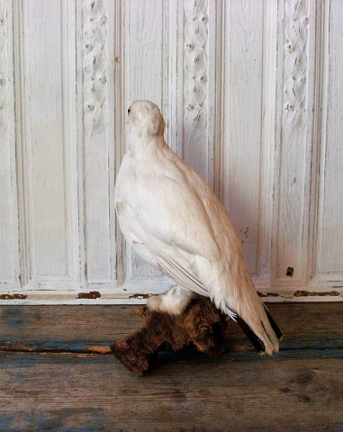 Skøn udstoppet rype i vinterdragt monteret på natur gren.