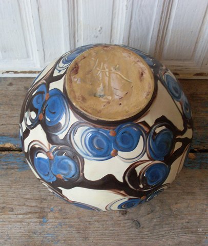 Smuk kohorns bemalet Kähler vase i blå, creme og mørkebrune farver. Fremstår i fejlfri stand. Signeret HAK. Højde 19cm. Diameter 21cm.