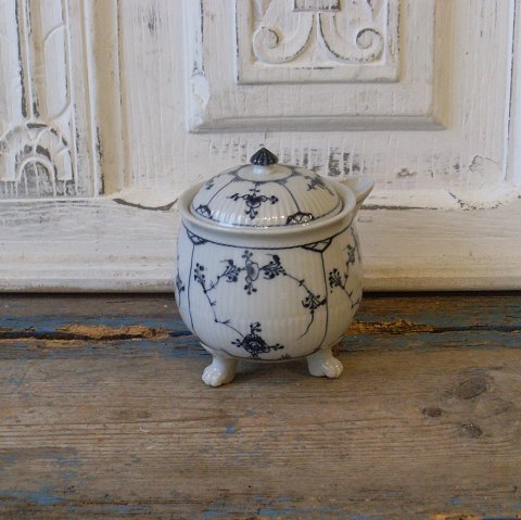Royal Copenhagen Musselmalet riflet antik flødepotte på tre ben med dyrepoter, lågknop som blomsterknop.