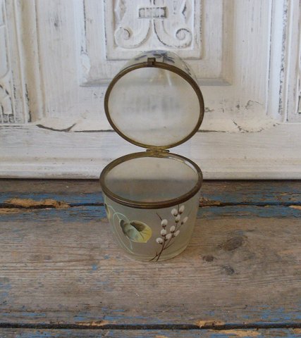 Stort ægformet smykkeskrin i glas med forgyldt bronze montering. Smuk dekoreret med violer og gæslingegrene. Højde 16,5cm. Diameter 9cm.