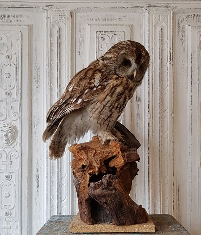 Meget flot natugle monteret på træstub. Rigtig fin stand, udført hos Dan Faun i Silkeborg. Højde 43 cm.