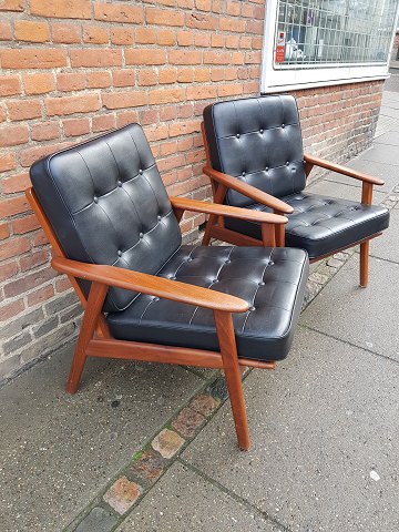 Pair of teak armchairs with black leather cushions