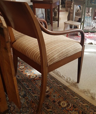 Pair of Empire armchairs in mahogany with nice intarsia work. Height 85 cm. Width 55 cm. Seat depth 48 cm.