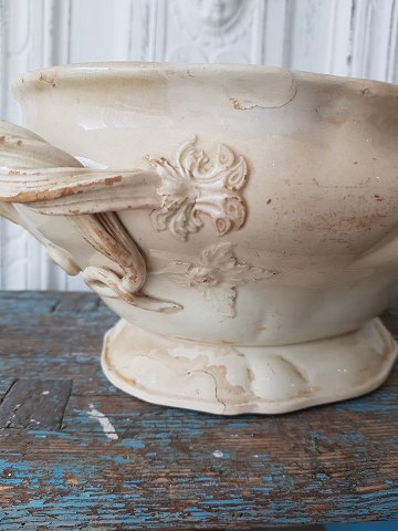 Engelsk creamware terrin ca. 1780 Antageligt fra Leeds Pottery Fremstår med et par nag samt reparationer - se billed. Mål 22 x 33 cm. Højde 21 cm.