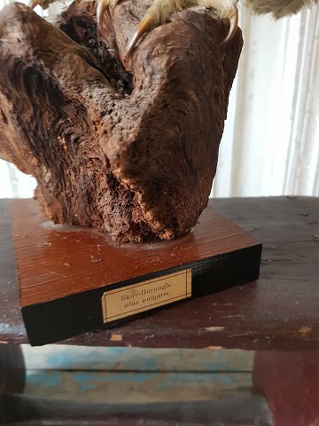 Stuffed forest horned owl with wide wings mounted on a tree stump Stupped at conservator Aaboe Sørensen in Silkeborg