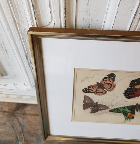 1800tals håndkoloreret tryk med sommerfugle i smuk enkel sølvramme.