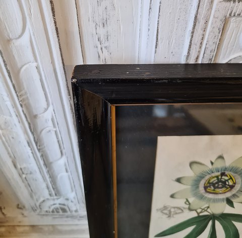 1800tals håndkoloreret botanisk tryk med passionsblomst i smuk gammel sort ramme med smal sølvkant. Mål: 25,5 x 33,5 cm.