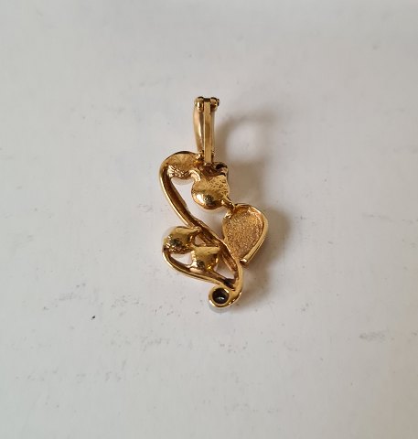 Vedhæng i 14 kt guld med 2 brillanter, 4 perler og opal. Øsknet kan lukkes op så det kan sættes på en perlekæde. Stemplet: 585 Mål 14 x 25 mm.